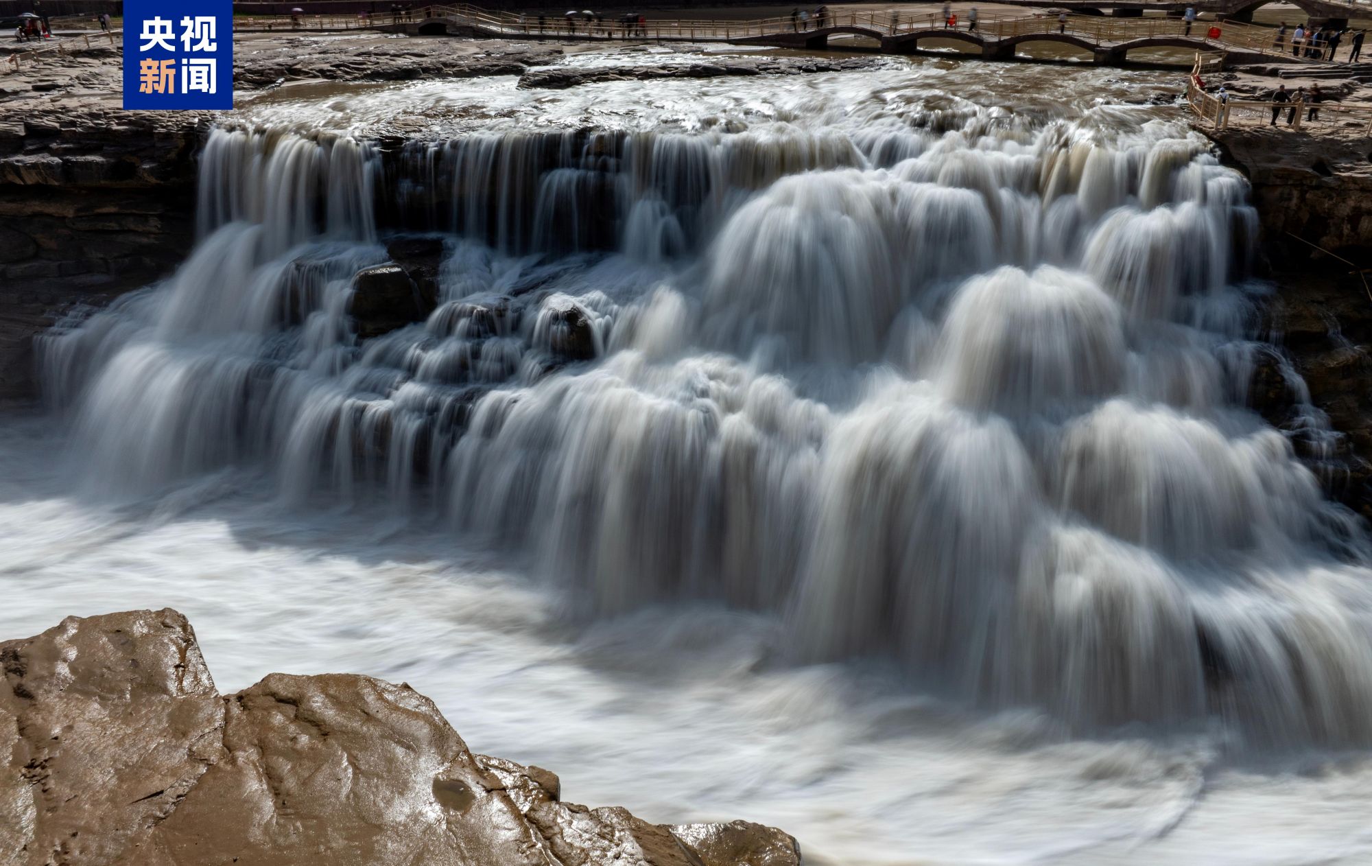 现场奔腾的黄河水经慢快门拍摄,化作如丝如缎的柔滑水幕,与河岸岩石相映成趣。